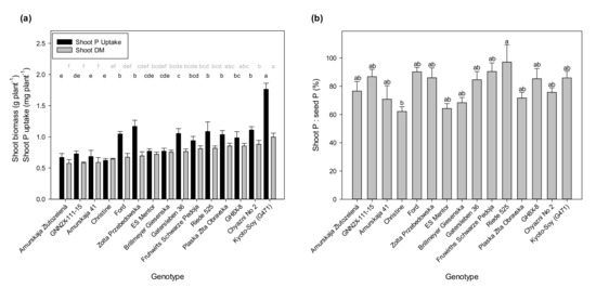 Experiment 1. Shoot P uptake, shoot biomass (a), and ratio of shoot P:seed P in percentage among the soybean genotypes, representing the relative contribution of seed P to shoot P uptake (b) among the soybean genotypes, sorted for shoot DM. The letters on top of each column represent Tukey’s HSD grouping. Error bars represent standard errors (n = 8).