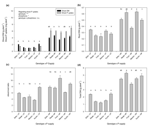Among root traits, we found differences in root DM, TRL, and RSA between the 15 genotypes in Experiment 1. [28] indicated that large seeds are superior to small seeds not only in plant shoot, but also in root weight, which we cannot confirm (cf. Figure S1). Among the five selected genotypes in experiment 2, we observed important differences in root DM only under HP conditions, while TRL and RSA showed only main effects.