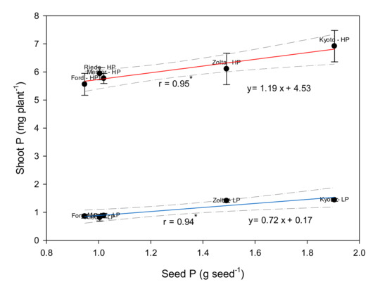 We have calculated linear regressions of shoot P on seed P to estimate the function parameters (Figure 5). The slope can be interpreted as an indicator of the amount of shoot P that was taken up per unit of seed P. This parameter was significant for each P supply level (1.19 and 0.72 for HP and LP, respectively). Obviously the regression slope at HP was 1.48-fold that at LP. Additionally, it was above or below 1 for HP or LP, respectively. This underlines the importance of seed P for shoot P uptake for both low and high P supply conditions, but with a stronger increase of shoot P per unit of seed P at elevated soil P supply.