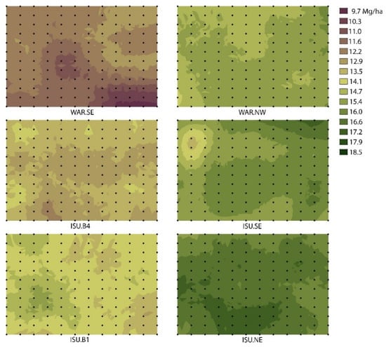 While the general shape of the curves was similar among all six sites, the degree of soil heterogeneity differed. The interpolated yield maps in Figure 3 illustrate the presence and degree of soil heterogeneity within each site.