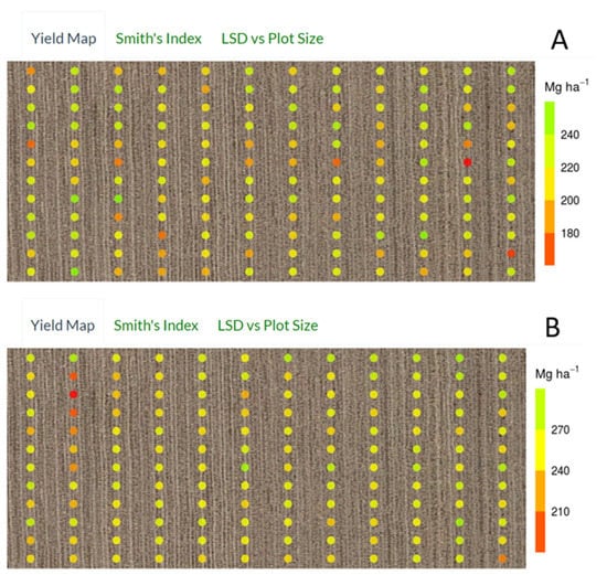 Maize yields from the six uniformity trials ranged from 7636 to 19,139 kg ha−1 (Figure 1), and the average difference between the minimum and maximum values within the trials was 6114 kg ha−1.