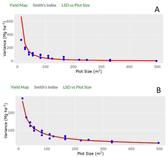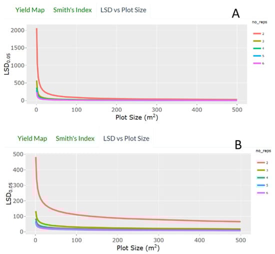 Output from a Shiny application to automate data compilation for uniformity trials. The output data include the regression of least significant difference on plot size for trials with two, four, or six replicates. Fields ISU.B4 (A) and ISU.SE (B) are used in this example. Relationship of Variance and Plot Size. Available online: https://marin-harbur.shinyapps.io/plot_size_app_for_uploaded_data/ (accessed 18 June 2021).