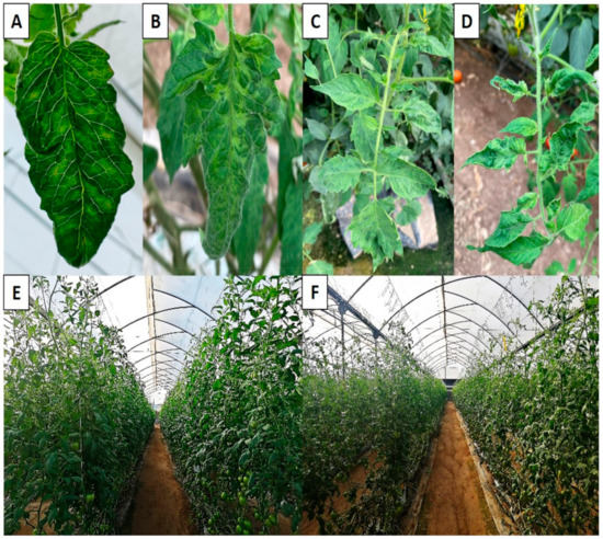 Foliar symptoms caused by ToBRFV in tomato plants cv. TOP–2299. (A,B) Severe mosaics on leaflets. (C,D) Deformation of leaves. (E) Low incidence of infected plants. (F) High incidence of infected plants.