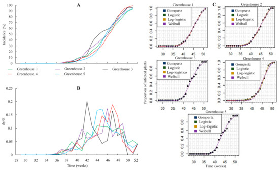 All epidemics represented by the progress curves obtained in the five greenhouses had a sigmoidal shape, characteristic of logistic models (log-logistic and logistic), which described the dynamics of the behavior of the disease during the productive cycle of the crop (Figure 2A). These types of curves were characterized by presenting an initial phase of the epidemic, where a slow increase in incidence was observed during weeks 28–41, followed by an exponential or rapid-growth phase of the disease between weeks 41–48, and a deceleration and stationary phase where incidence values slowly approached 100% during weeks 48–51 (Figure 2A and Table 3).