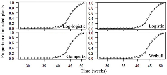 The type of graph that represents the logistic models (log-logistic and logistic) is a classic sigmoidal shape, which comprises an initial phase where a slow increase in incidence occurs; then, it increases rapidly in the exponential-growth phase, and lastly slowly approaches the maximal number of infected individuals in the deceleration and stationary phases at the end of the epidemic assessment period [21,40,41], which agrees with what was found in this study with ToBRFV (Figure 6 and Table 3).