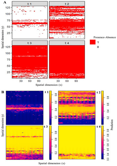 Analysis of spatial distribution of ToBRFV in commercial tomato greenhouses. (A) Sequence observations of presence (1) and absence (0) in space as a function of time based on area patters. (B) Spatial distribution of presence (1) or absence (0) based on point patterns using inverse distance point interpolation (IDW) (t1 = Week 41, t2 = Week 48, t3 = Week 50, and t4 = Week 51). Maps represent spatial dynamics of the disease in Greenhouse 5.