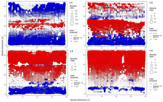 Analysis of spatial distribution of ToBRFV in commercial tomato greenhouses based on Sadie index (t1 = Week 41, t2 = Week 48, t3 = Week 50, and t4 = Week 51). SADIE index range: values of index range > 1.5 indicate aggregation of the inoculum source, values of index range < 1.5 indicate aggregation of healthy plants, and values between −1.5 and 1.5 indicate areas of interception of the two phenomena. Circle size and color (red and blue) indicate the size, intensity, and dimension [36] of the phenomenon (healthy or infected areas).