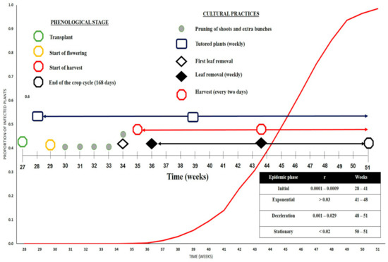 Logistic models are best-suited to represent polycyclic diseases, which are characterized by presenting multiple infection cycles during the crop production cycle [21,40,41]. This was evidenced in the rapid-growth phase of this epidemic, where the proportion of diseased plants increased due to the implementation of cultural practices (leaf removal, tutoring, and harvesting) carried out in high-intensity tomato production systems throughout the crop production cycle, thus favoring the mechanical transmission of virus (Figure 6). This polycyclic pathosystem also included the constant production of inoculum mediated by the viral replication processes inside the host cells [42], and the rapid dispersal and subsequent infection of new contacted individuals [18,21,41]. The phenomenon of mechanical transmission was explicitly observed from Week 35 onwards, mainly because, from that date, intensive harvesting work began (every other day), favoring viral transmission through personnel, and direct contact between diseased and healthy plants [8,18]. In addition to harvesting, during weeks 35–51, cultural practices such as tutoring and leaf removal were performed on a weekly basis, further increasing the risk of contagion between plants, thus spreading the virus within the greenhouses (Figure 6).