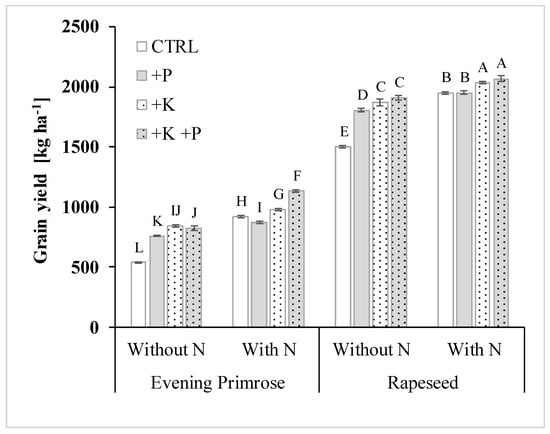 On average, Rapeseed produced 119% more grain than Evening Primrose and such an increase was more evident when no N was applied (from +122% to +179%) than under N fertilization (from +82% to +124%). Application of fertilizer increased on average the yield by the species to a dramatically lower extent compared to the species choice, with N, P, and K fertilization increasing grain yield by 18.5%, 13.2%, and 6.4% on average between species. When no N was applied, K fertilization increased grain yield more than P, whereas under N fertilization the role of both P and K fertilization in grain yield was scarce (Figure 1).