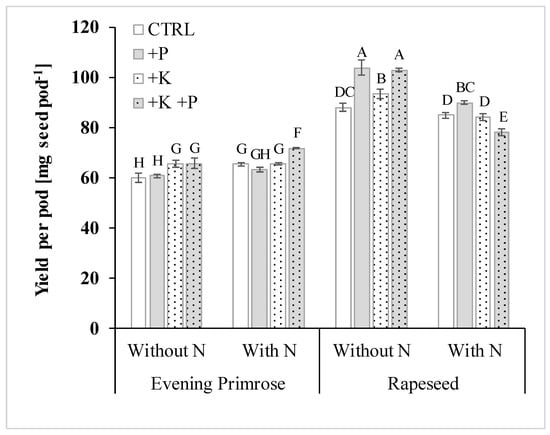 In the non-N fertilized Evening Primrose, K increased the yield per pod by 8.8%, whereas P did not affect it. In the N fertilized Evening Primrose, a similar increase in the yield per pod (+9.8%) was found when both P and K were applied, but not when applied singularly. In contrast to the Evening Primrose, yield per pod in the non-N fertilized Rapeseed increased by 18.0% when P was applied alone and by 16.9% when both P + K was applied, whereas when K but not P was applied, it increased by only 6.1%. In the N fertilized plot, application of P alone slightly increased the grain per pod (+6.0%), whereas application of K alone did not, and the application of both P and K decreased grain per pod by 7.9%.