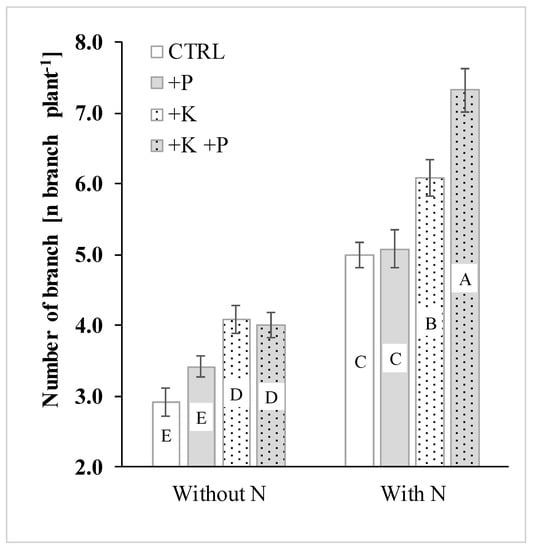 Least squares means (LSmeans) and standard error of the LSmeans of the number of branches per plant in Oenothera biennis L. local genotype (Evening Primrose) and Brassica napus L cv. serw 1 (Rapeseed) grown in 2 growing seasons in a P and K deficient soil and fertilized with 142.9 kg N ha−1, 171.4 kg K2O ha−1, or 36.9 kg P2O5 ha−1. Data are means of the species. Means with a letter in common cannot be considered different according to a conservative Tukey-grouping applied to the p differences of the LSmeans. N = 12. Please note that error bars are standard error estimates of the LSmeans and not the computed standard error, which can be found in Supplementary Materials Table S1. CTRL indicates a lack of P and K applications.
