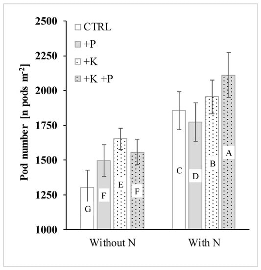 Least squares means (LSmeans) and standard error of the LSmeans of the number of pods per unit area in Oenothera biennis L. local genotype (Evening Primrose) and Brassica napus L cv. serw 1 (Rapeseed) grown in 2 growing seasons in a P and K deficient soil and fertilized with 142.9 kg N ha−1, 171.4 kg K2O ha−1, or 36.9 kg P2O5 ha−1. Data are means of the species. Means with a letter in common cannot be considered different according to a conservative Tukey-grouping applied to the p differences of the LSmeans. N = 12. Please note that error bars are standard error estimates of the LSmeans and not the computed standard error, which can be found in Supplementary Materials Table S1. CTRL indicates a lack of P and K applications.