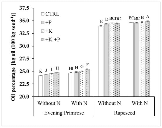 Seed oil concentration and oil yield were similar but more pronounced, the response to the treatments compared to the response for the seed yield. Rapeseed oil concentration was 9.5% to 10.1% more than Evening Primrose. Rapeseed produced 119.4% more seed and 206.0% more oil than Evening Primrose, which implies a better ability of this species to accumulate oils in the conditions under study. Such a difference was more pronounced under N limiting conditions than in the N fertilized treatments. In addition, K favored Evening Primrose oil yield when no N or P was added, whereas P favored the oil yield in Evening Primrose more than Rapeseed in almost all conditions. However, little variation was found in the seed oil concentration among treatments, thus oil yield mostly depended on seed yield. A similar result of the N and P interaction was found by Cheema et al. [41] in canola. Additionally, Said-Al Ahl et al. [49] found that P increased oil yield in Rapeseed when applied at a fourfold rate than the present study. Ghasemnezhad and Honermeier [20] found a slight reduction of the seed oil concentration of Evening Primrose when increasing N concentration from 167 ppm to 333 ppm, whereas yield increased mostly when increasing N concentration from 83 ppm to 167 ppm. The latter authors [21] found a scarce effect of the variation of the soil N concentration on the seed oil concentration of Evening Primrose below 100 ppm. This implies that the N supply stimulates Evening Primrose oil accumulation after the species had satisfied its N needs for the grain yield. Since soil N concentration was low in the present study, this could explain the lack of N effects on the seed oil accumulation. In such conditions, the application of K but not P allowed an increase in crop performances in terms of oil accumulation. These results agree with Ali et al. [55] in borage, who found that half of the dose of K applied in the present study was sufficient to increase seed yield but not seed oil concentration. Indeed we also found that application of K, which strongly contributes to a regulation of the transpiration, increased oil concentration and yield more in Evening Primrose than Rapeseed. In addition, we cannot exclude that the application of sulfur through the K fertilizer may also have inadvertently stimulated the oil yield, as seen by Jankowski et al. [56], or sustained the K uptake [24]. In contrast to K, the scarce effect of the application of P may have been due to the timing and method of application used in the present experiment, which may have reduced its benefit. In particular, the high soil pH very likely leads to a P sequestration, and surface applications may have strongly reduced the P availability [57,58]. A potential effect on the oil concentration and yield may have been seen with higher fertilizer application, however, further increasing nutrient concentration in the soil in the area under study may have lead to additional stresses, especially drought stresses, due to a stimulation of the transpiration, as also seen in other grain species in similar conditions [59]. Nonetheless, we found that the nutrient supply scarcely affected the lipid composition, which appeared strongly related to other stresses or genetic aspects in many species, including Evening Primrose [31,60,61,62].