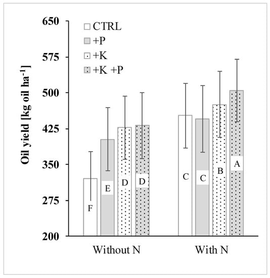 In particular, under non-N fertilized conditions, the application of P increased oil yield by 25.9% compared to no fertilizer application and such an increase was more evident when K was applied (+33.6% to 34.9%) irrespective of the P application. Under N fertilization, application of only K, but not only P, slightly increased oil yield (+5.2% compared to the non-N fertilized, non-P fertilized treatment) and such an increase was more evident when both P and K were applied (+11.7% compared to the N fertilized, non-P, non-K fertilized treatment).