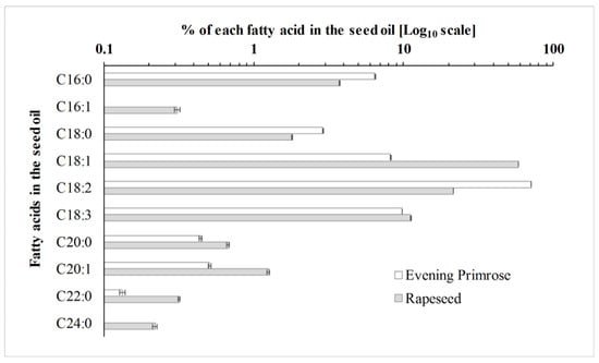 Rapeseed and Evening Primrose seeds were crushed and grounded with a grinding mill (Petra electric, Burga, Germany). The oil was extracted from the ground material with n-hexane at 50–60 °C in a Soxhlet apparatus for 6 h following the AOCS method [29]. Total lipid concentration was determined as a percentage of the extracted total lipids to the sample weight (w/w). The oil obtained was stored at 4 °C for further investigation.