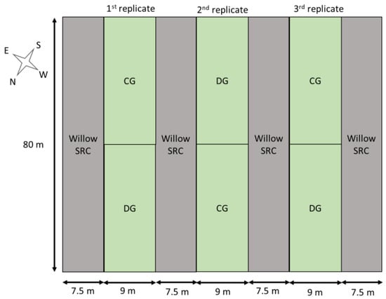 Following winter barley harvest, three cropping systems were established in March 2011: (a) a grassland reference, (b) a willow SRC reference, and (c) an agroforestry system combining grassland and willow SRC []. The agroforestry system consisted of four alternating rows of willow SRC and three rows of grassland in the alleyways []. The total area of the alley cropping system was 0.7 ha, with 45% covered by willows and 55% by grassland. The width of grassland alleyways was 9 m, and the length was 80 m. Willows were planted in 7.5-m wide and 80-m long rows (Figure 1).