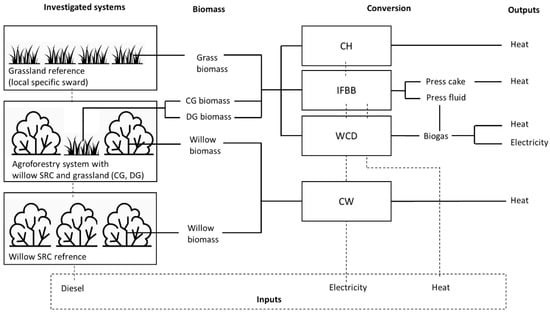 General framework of investigated systems, biomass sources (CG = clover grass; DG = diverse grassland mixture, SRC = short rotation coppice) and energy conversion pathways (CH = combustion of hay, IFBB = integrated generation of solid fuel and biogas from biomass, WCD = anaerobic whole crop digestion, CW = combustion of willow woodchips).