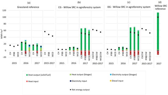 Energy input, output, and net energy yields of (b) clover grass (CG) and willow short rotation coppice (SRC) in agroforestry system and (c) diverse grassland mixture (DG) and willow short rotation coppice (SRC) in agroforestry system compared to grassland reference stand (a) and willow short rotation coppice (SRC) reference stand (d) in the second rotation after establishment. Four conversion technologies were applied: combustion of hay (CH), integrated generation of solid fuels and biogas from biomass (IFBB), whole crop digestion (WCD) and combustion of willow woodchips (CW).