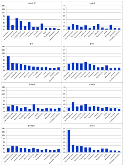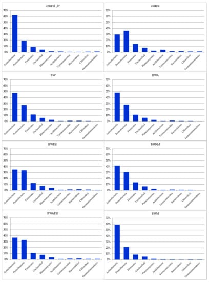 The percentage content of selected bacterial phylum in the experimental variants. Explanation: control ‘0’—without fertilisers and plant cultivation, control—the control variant without fertilisers, with plant cultivation, BW—biochar fertiliser, BWM—biochar fertiliser with mycorrhizal fungi, BWE11—biochar fertiliser with Bacillus bacteria, BWA—biochar fertiliser with algae, BWAE11—biochar fertiliser with algae and Bacillus sp. bacteria, BWAM—biochar fertiliser with algae and mycorrhizal fungi.