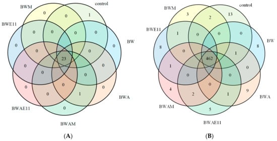 A Venn diagram of overlapping bacterial communities from the variants ((A)—phylum, (B)—genus) Explanation: control ‘0’—without fertilisers and plant cultivation, control—the control variant without fertilisers, with plant cultivation, BW—biochar fertiliser, BWM—biochar fertiliser with mycorrhizal fungi, BWE11—biochar fertiliser with Bacillus bacteria, BWA—biochar fertiliser with algae, BWAE11—biochar fertiliser with algae and Bacillus sp. bacteria, BWAM—biochar fertiliser with algae and mycorrhizal fungi.