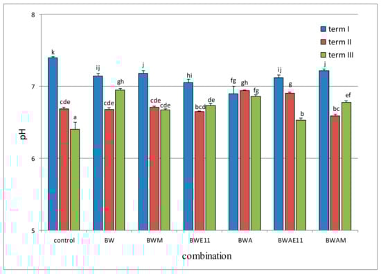 The changes of the pH value of soil. Explanation: Means followed by the same letters do not differ significantly at p ≤ 0.05; control—the control variant without fertilisers, BW—biochar fertiliser, BWM—biochar fertiliser with mycorrhizal fungi, BWE11—biochar fertiliser with Bacillus bacteria, BWA—biochar fertiliser with algae, BWAE11—biochar fertiliser with algae and Bacillus sp. bacteria, BWAM—biochar fertiliser with algae and mycorrhizal fungi; I—1st term—one week after fertilisation and sowing, II—2nd term—at the flowering phase, III—3rd term—harvesting phase.