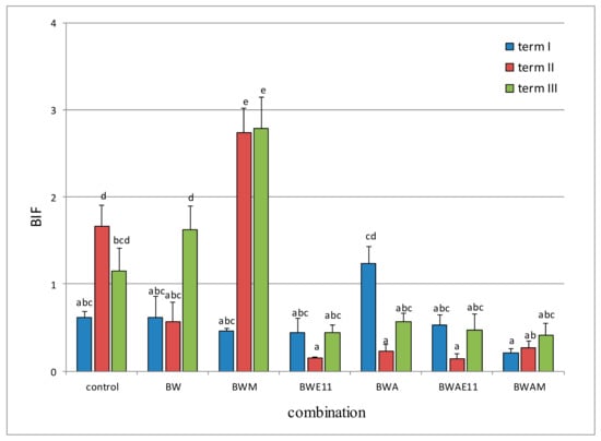 The changes of Biological Index of Fertility (BIF) in a soil. Explanation: Means followed by the same letters do not differ significantly at p ≤ 0.05; control—the control variant without fertilisers, BW—biochar fertiliser, BWM—biochar fertiliser with mycorrhizal fungi, BWE11—biochar fertiliser with Bacillus bacteria, BWA—biochar fertiliser with algae, BWAE11—biochar fertiliser with algae and Bacillus sp. bacteria, BWAM—biochar fertiliser with algae and mycorrhizal fungi; I—1st term—one week after fertilisation and sowing, II—2nd term—at the flowering phase, III—3rd term—harvesting phase.
