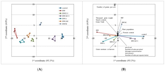 Venn diagrams were used to show the similarities and differences in the species composition of experimental variants representing the reactions of maize and soil enzymes to the type of biofertiliser applied. The datasets were also analysed with canonical variate analysis (CVA), a form of multivariate analysis, which enables visualisation of the relationships between experimental variants and the variables that describe them [,,]. This method, similar to principal component analysis, was chosen because it considers differences between groups []. The relations between selected experimental variants described by the reactions of maize and soil enzymes to the type of biofertiliser applied were analysed with canonical variate analysis based on transformation by linear combination [] and singular value decomposition [,]. The CVA also showed relations between the variables (BIF, soil pH, chemical parameters, and yield) by determining the components being a linear combination of these variables.