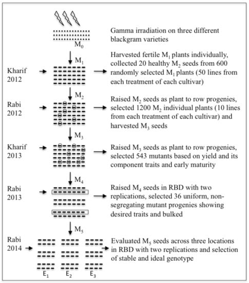 Schematic illustration for development of novel blackgram mutant and genotype × environment interaction for yield-related traits through mutation breeding.