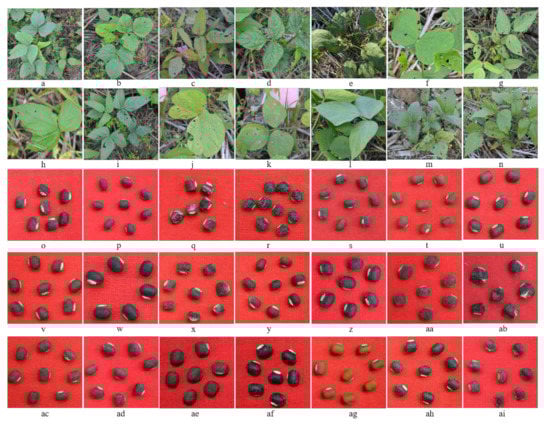 Variation observed in leaf and seed characteristics of cv. ADT 3, Co 6, and TU 17-9 mutagenized populations. (a) cv. ADT 3 (wild); (b–g) leaf variations in cv. ADT 3 mutagenized population. (h) cv. Co 6 (wild); (i,j) leaf variation in cv. Co 6 mutagenized population. (k) cv. TU 17-9 (wild); (l–m) leaf variations in cv. TU 17-9 mutagenized population. (o) cv. ADT 3 (wild); (p–u) seed characteristic variations in cv. ADT 3 mutagenized population. (v) cv. Co 6 (wild); (w–ab) seed characteristic variations in cv. Co 6 mutagenized population. (ac) cv. TU 17-9 (wild); (ad–ai) seed characteristic variations in cv. TU 17-9 mutagenized population.
