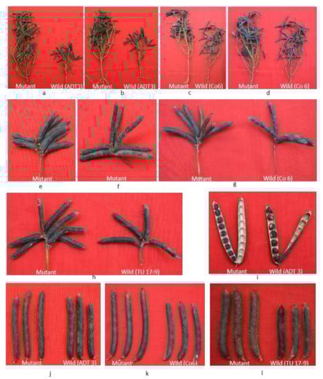 Mutants showing variations in yield-related traits: (a,b) mutants derived from cv. ADT 3 exhibiting increased pod numbers per plant, (c,d) mutants derived from cv. Co 6 showing increased pod numbers per plant; (e–g) mutants derived from cv. Co 6 exhibiting increased pod numbers per cluster; (h) mutant derived from cv. TU 17-9 showing increased pod numbers per cluster; (i) mutant derived from cv. ADT 3 exhibiting increased seed numbers per pod; (j–l) mutant derived from cv. ADT 3, Co 6, and TU 17-9 showing increased pod length.