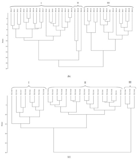 Dendrograms of blackgram mutant population clustering based on nine yield-related traits: (a) dendrogram using Euclidean similarity index and UPGMA algorithm for cv. ADT 3 mutant population; (b) dendrogram using Euclidean similarity index and UPGMA algorithm for cv. Co 6 mutant population; (c) dendrogram using Euclidean similarity index and UPGMA algorithm for cv. TU 17-9 mutant population.