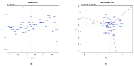 AMMI model: (a) AMMI-I explaining main and IPCA-1 interaction for grain yield; (b) AMMI-II explaining interaction effect of IPCA-1 and IPCA-2 for grain yield.