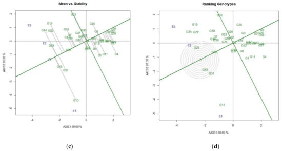 The present research showed that E1 was more discriminating and E2 was a highly representative environment as they had the longest vector and smallest angle, respectively (Figure 6b), demonstrating their suitability as research environments for the multienvironment trial. The ideal environment can be identified using the average environment axis (AEA). The stability of the genotypes can be predicted using the average environment coordinate (AEC). A stable genotype displays a short upright line to the AEC axis. In contrast, the increase in perpendicular line length shows a decline in genotype stability. Genotypes G36, G5, G15, G2, and G9 were very stable and showed good to low grain yield potential. G13 was extremely unstable; along with G33, G19, and G34, it was very far off the AEC axis and expressed good to average yield capability (Figure 6c). The genotypes were ranked considering all three locations for grain yield (Figure 6d). The biplot described the stable genotypes with the longest vectors, along with zero G × E, by points and arrows. It was seen that the AEA projection was near zero for G18 and G29 followed by G31 and G36.