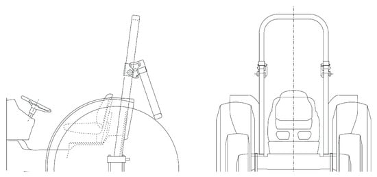 Generally, the FROPS comprises two lower steel components, one for each side of the tractor, mounted in front of or on the back of the driving seat, and an upper inverted U-shaped folding steel tube. The lower and upper parts are joined at a pivot point by a couple of pins on each side of the protective structure, making it possible to fold the upper part frontward or rearward, based on the FROPS type (Figure 1). The folding operation is generally manual, even though some dimensions and mass of the components may overcome the human handling capacity, as observed in previous works [16,17] on standard tractors.