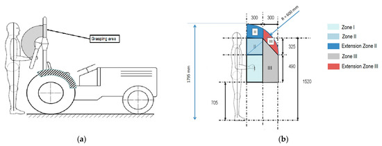 The OECD Codes [13,14] define the grasping area as “the portion of the ROPS and/or additional handle fitted to the ROPS where the operator is allowed to carry out the raising/lowering operations” (Figure 2a) and the accessible zones in the human–FROPS interaction as “the volume where an operator standing on the ground can apply a force to raise/lower the ROPS” [14] (p. 22). The three accessible zones are defined as Zone I—comfort zone, Zone II—accessible zone without forward-leaning of the body, and Zone III—accessible zone with forward-leaning of the body. The two areas above Zone II and Zone III, indicated as Extension of Zone II and Extension of Zone III, are the acceptable extensions of the two respective accessible zones (Figure 2b).