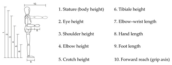 The ten measurements considered to represent the human figure in the present study. Based on Jurgens et al. [37] dataset (in which the anthropometric measurements of male and female individuals were considered together), the human figure is represented through a sexless manikin.