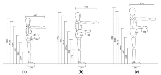 Human figure representations based on European anthropometric data [37] considering the ten variables of interest: (a) 5th percentile, (b) 50th percentile, and (c) 95th percentile.