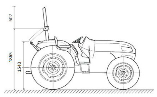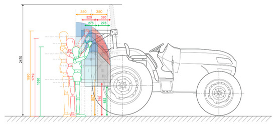 The enhanced image of the tractor has been defined based on the three most important measurements related to the points of interaction with FROPS as observed in previous studies on standard tractors [16,17]: (1) distance from ground to FROPS in the folded-down position (45° angle between the upper folding part and the lower component of FROPS); (2) distance from ground to FROPS pivot pin, which corresponds to the height of FROPS raised forming a 90° angle; (3) distance from FROPS pivot pin to the top of the fully raised roll-bar (Figure 5).