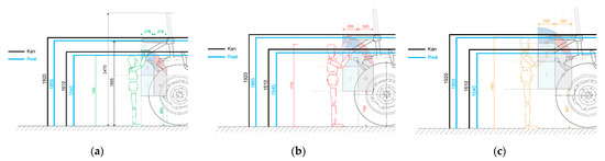 In Figure 8, the three percentiles figures, with the respective redesigned accessible zones in interaction with the FROPS, are represented: the blue lines represent the height of gripping points at 45° and 90°, measured in the real situation (based on [17]); whereas the black ones represent the heights of the gripping point suggested as optimal in the KAN Study 50 [45] for grasping machinery parts at the same angles of the roll-bar. Comparing the two lines for each position of the FROPS, it is possible to note how the dimensions recorded during on-field observations are just below the height values suggested as optimal in the KAN Study 50 for both the roll-bar angles.