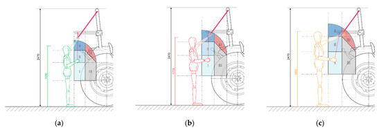 Starting from elements depicted in Figure 6, the grasping area was considered and the real distances from the ground to the manually operated part (i.e., the gripping point of the roll-bar) were compared with those reported in the KAN Study 50 (2013) for swivelling agricultural machines manually operated parts in lifting and lowering movements (Figure 8). The comparison was useful to verify the reliability of the proposed accessible zones with respect to the required posture.