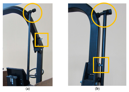 The rod proposed as a solution to increase FROPS reachability. In both figures (a,b), a coloured square highlights the fixing and connection joint of the rod with the FROPS, while a coloured circle highlights the retention mechanism to lock the rod when in rest position.