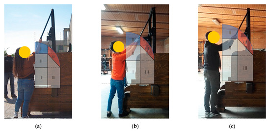Sketches of the suggested solutions proposed, used by (a) the 5th percentile figure, (b) the 50th percentile figure, and (c) the 95th percentile figure, and its testing against the new accessible zones, to increase the users’ reachability for FROPS handling.