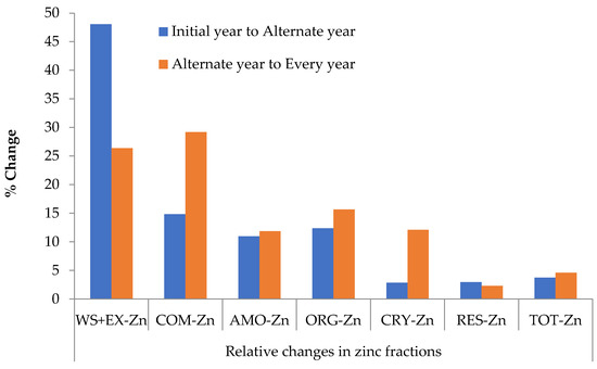 The percent distribution in the remaining all fractions increased with Zn load. The percent concentration of Zn in different pools increased as per different frequencies of Zn application according to the following order, initial year-application < alternate years-application < every year-application (Table 4). The relative increment in Zn concentration in alternate years and every year over the initial year of Zn application was about 48% and 26% for WS+EX-Zn fraction; 15% and 29% for COM-Zn fraction; 11% and 12% for AMO-Zn fraction; 12% and 16% for ORG-Zn fraction; 3% and 12% for CRY-Zn fraction; 2.93 and 2.31 for RES-Zn fraction; and 4% and 5% for TOT-Zn, respectively (Figure 1).