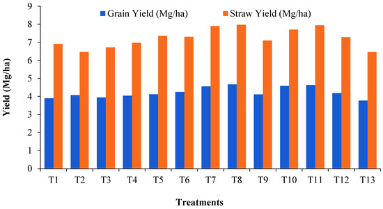Different Zn fertilization methods significantly influenced the yield of wheat after 6-year of study. Wheat seed, as well as straw yields, were varied from 3.77–4.67 mg ha−1 and 6.46–7.97 mg ha−1, correspondingly, due to having different Zn applications (Table 5, Figure 2).