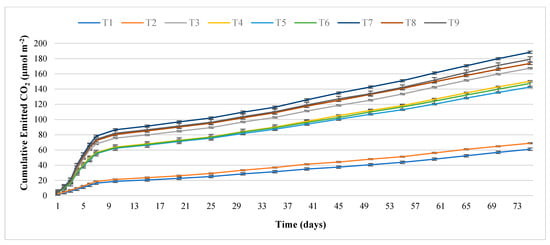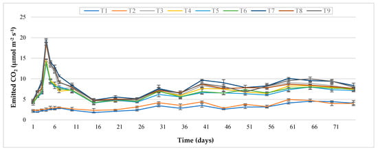 Soil CO2 flux was measured with a portable LI-8100 automated soil CO2 flux system (LI-COR Biosciences, Lincoln, NE, USA) on days 1, 2, 3, 4, 5, 6, 7, 10, 15, 20, 25, 30, 35, 40, 45, 50, 55, 60, 65, 70, and 75. The polyvinyl chloride (PVC) pipe was 11.5 cm in height and 20 cm inner diameter, installed 7–8 cm into the soil in each pot one day before the first measurement. All the PVC collars were left in the soil until the end of the experiment. The soil around the external side of all PVC collars was firmly compacted to avoid gas leakage. The measurement of soil CO2 flux was taken from 9.00 a.m. to 11.00 a.m. []. Cumulative soil CO2 emission was calculated by linear interpolation [].