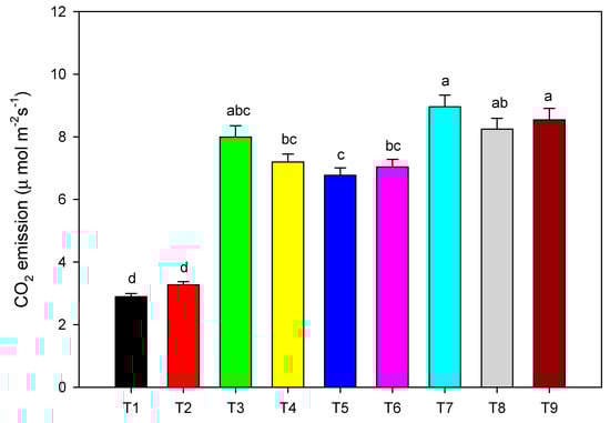 Average CO2 emission rate across all measured dates. Same letters are not significantly different above bar at p ≤ 0.05. T1 = No treatments and fertilizer (Control), T2 = Recommended rate of NPK (t ha−1), T3 = 100% dolomitic limestone, T4 = 100% dolomitic limestone + 10 t ha−1 rice husk biochar, T5 = 75% dolomitic limestone + 10 t ha−1 rice husk biochar, T6 = 75% dolomitic limestone + 15 t ha−1 rice husk biochar, T7 = 100% dolomitic limestone + 10 t ha−1 oil palm empty fruit bunches biochar, T8 = 75% dolomitic limestone + 10 t ha−1 oil palm empty fruit bunches biochar, T9 = 75% dolomitic limestone + 15 t ha−1 oil palm empty fruit bunches biochar.