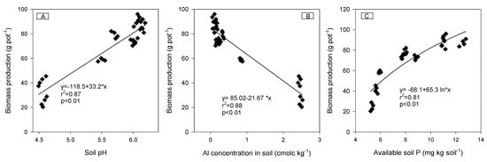 Relationship between soil pH and biomass production (A), exchangeable Al concentration in soil and biomass production (B), and available soil P and biomass production (C). The asterisk stands for multiplication sign.