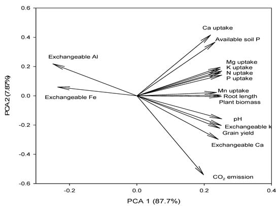 Co-application of lime and biochar increased biomass and grain production of maize, along with other yield contributing factors, while across all lime treatments, RHB was more effective than EFBB. We believe that soil pH is one of the most important factors contributing to yield enhancement [], because soil pH was much higher in these treatments (~8.0) than in the control, while there was a significant correlation between biomass/grain production and soil pH (Figure 4). An increase in soil pH might have favored nutrient uptake, while the toxicity of Al and Fe was also reduced (Figure 4). Our PCA supported (Figure 5) this argument. The plant was also supported with greater nutrient availability through enhanced microbial activity, since the CO2 release rate (a proxy of microbial activities) was higher in this treatment. According to Masulili et al. [], reducing Al and Fe content due to increased soil pH may be an essential factor in improving plant growth. Our result is also in agreement with those of Pandit et al. []. Cob length, fresh cob weight, and number of grains per cob were significantly higher upon biochar with lime addition. The combination of organic amendments and lime (T4 to T9) is favorable because it enhances the nutrient release and decreases the nutrient (N, P, K) losses, which results in the higher yield of maize []. The reduction of soil acidity, Al and Fe toxicity, and plant nutrient availability enhanced the maize cob and yield parameters [].