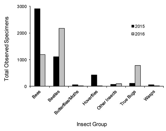 In total, 4770 insects were observed foraging on experimental flowers in 2015, and 4289 insects were observed in 2016 (Figure 1). In 2015, the greatest number of observed visits was by bees (2913 visits), then beetles (1110), hoverflies (435), true bugs (115), other insects (78), butterflies and moths (63), and wasps (56). In 2016, the most frequently observed flower visitors were beetles (2172 visits), then bees (1194), true bugs (788), other insects (96), hoverflies (16), wasps (14), and butterflies and moths (9).