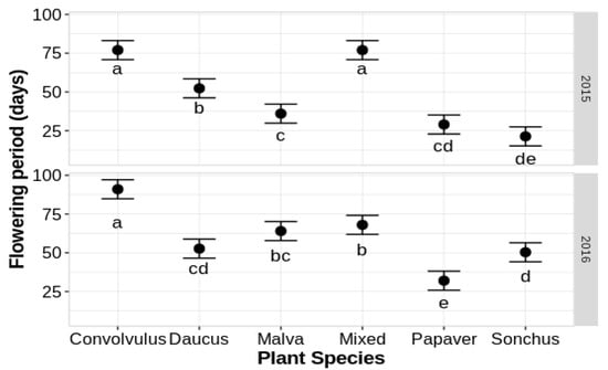 Differences in the lengths of the flowering periods between flower treatments in both years of the study (2015 and 2016). Values are the estimated marginal means from the general mixed-effects model. Bars show confidence intervals at the 0.95 level. Letters indicate differences between treatments derived from post hoc pairwise comparisons using the Tukey method for p-value adjustment. Contrasts were performed between treatments and for each year separately. Flower species are indicated by genus.